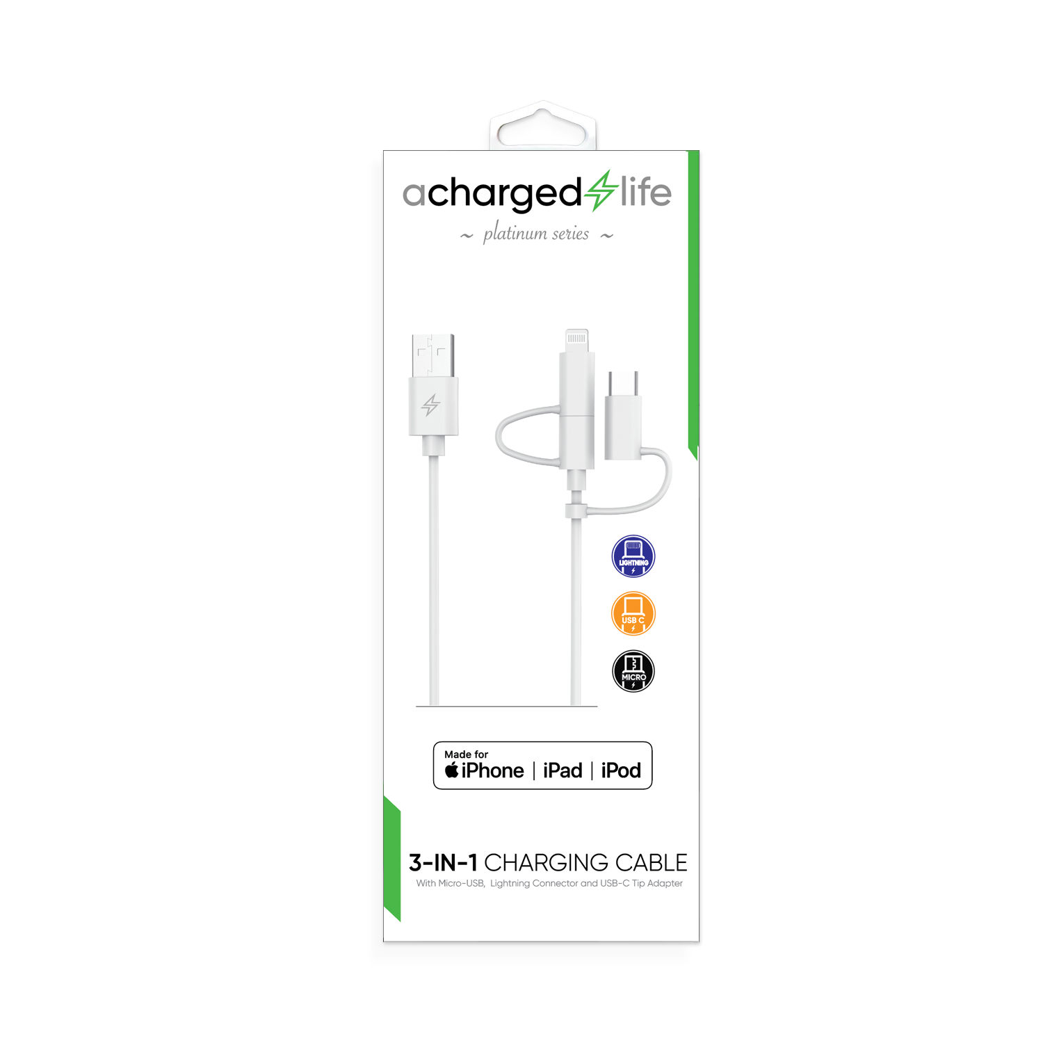 Simplify your charging setup with our 3-in-1 Charging Cable. Featuring Micro-USB, Lightning, and USB-C tip connectors, this all-in-one solution is perfect for powering up a wide range of devices. Whether you're at home, in the office, or on the go, enjoy fast, reliable charging in a single, clutter-free cable. MFi certified for Apple device safety and performance.