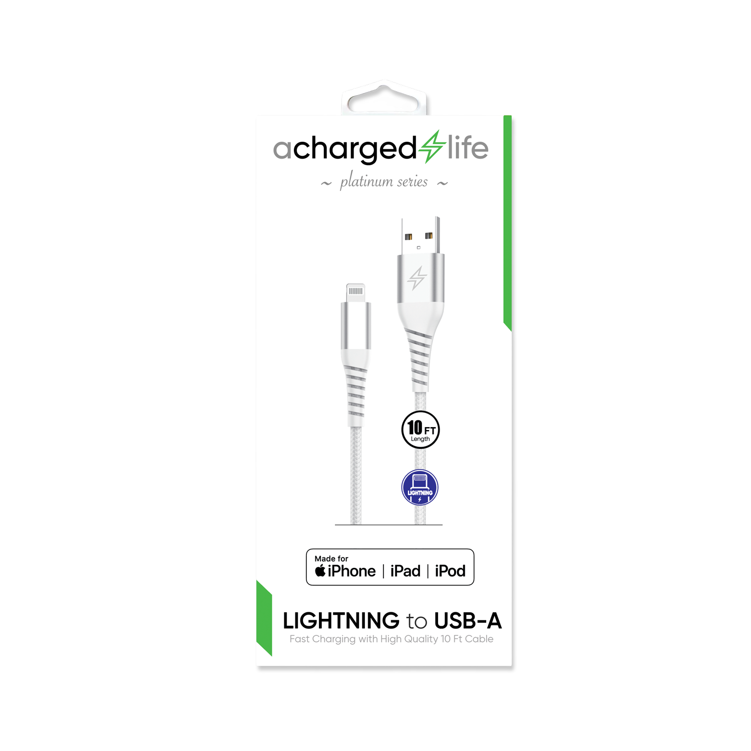 Charge and sync your Apple devices with confidence using our MFi Certified 10ft Lightning to USB-A Cable. With a durable braided design and extended reach, this cable delivers fast 2.4A charging and seamless data transfer. It's built to withstand 10,000+ bends, making it ideal for everyday use at home, in the office, or on the go.