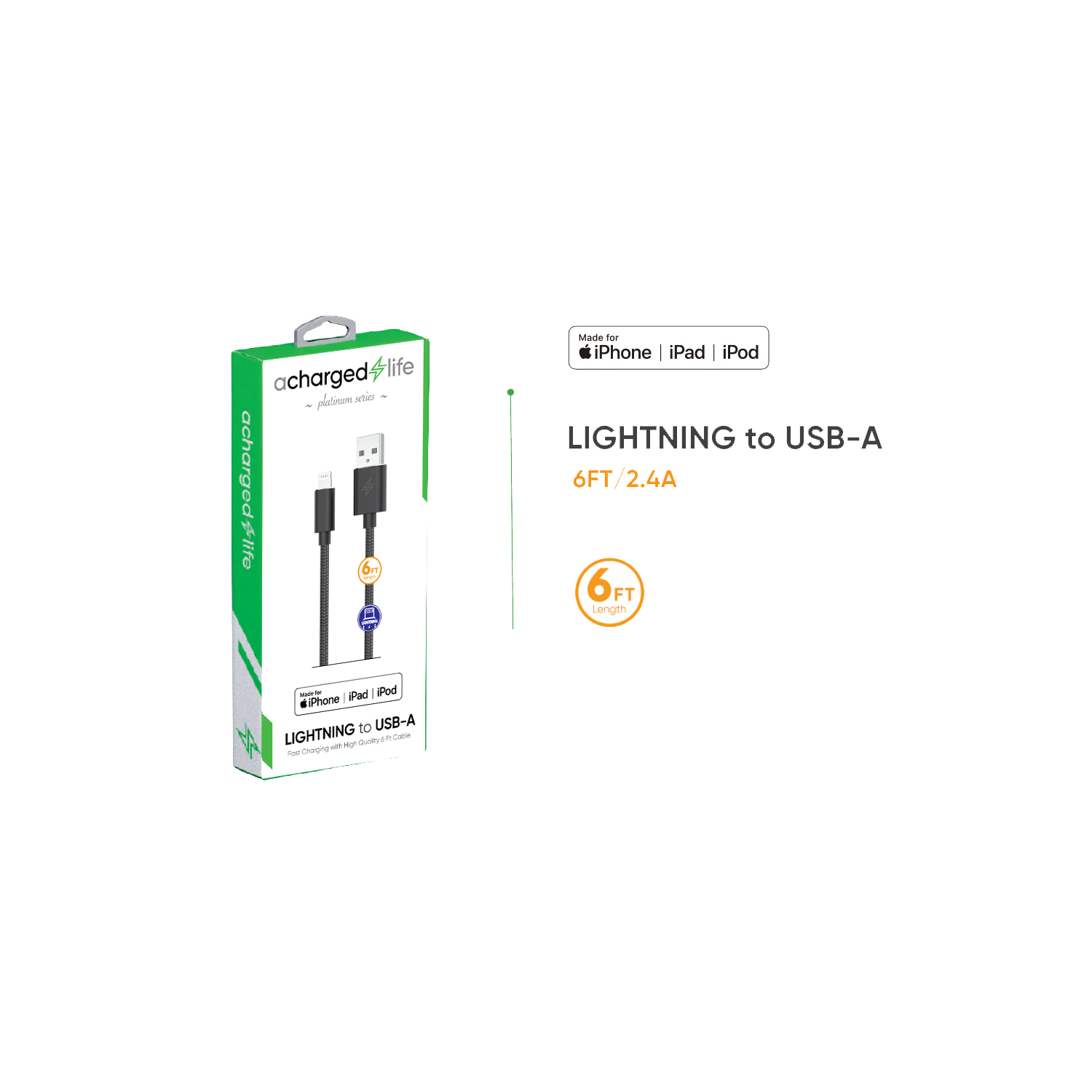 Charge and sync your Apple devices with confidence using our high-quality Lightning to USB-A 6ft Cable. Built to deliver fast, reliable charging with a durable braided design, this cable ensures extended reach and lasting performance. With MFi certification and a built-in Apple chip, it's fully compatible with your iPhone, iPad, and iPod. Perfect for travel, work, or home use.